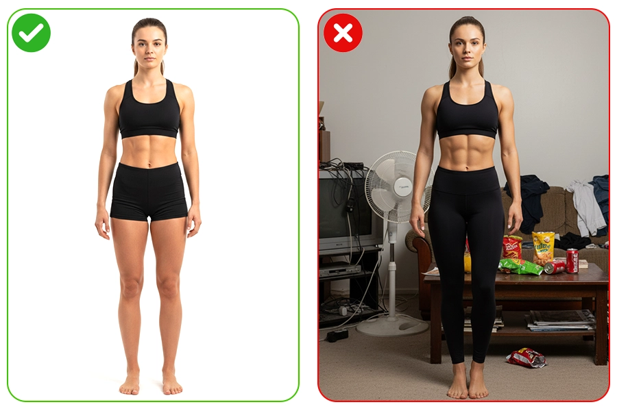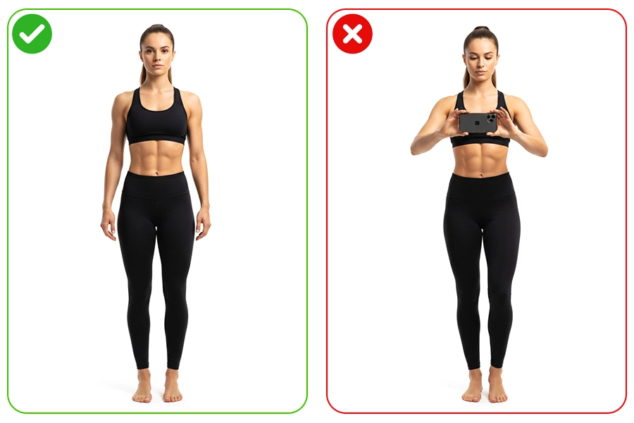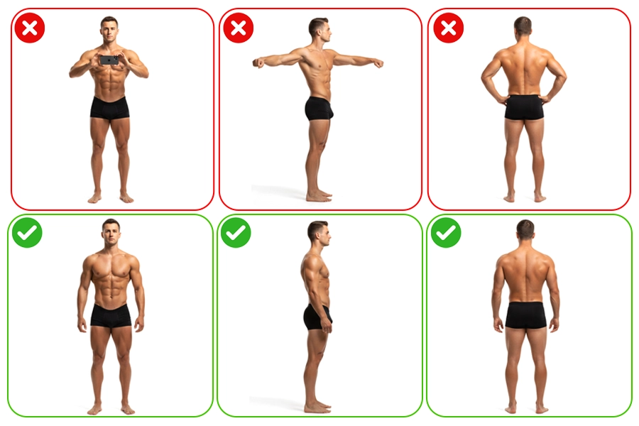 • هنگام ثبت عکس، بدن شما باید بهطور کامل (از نوک انگشتان پا تا بالای سر) در کادر تصویر قرار بگیرد و بهصورت واضح قابل مشاهده باشد.