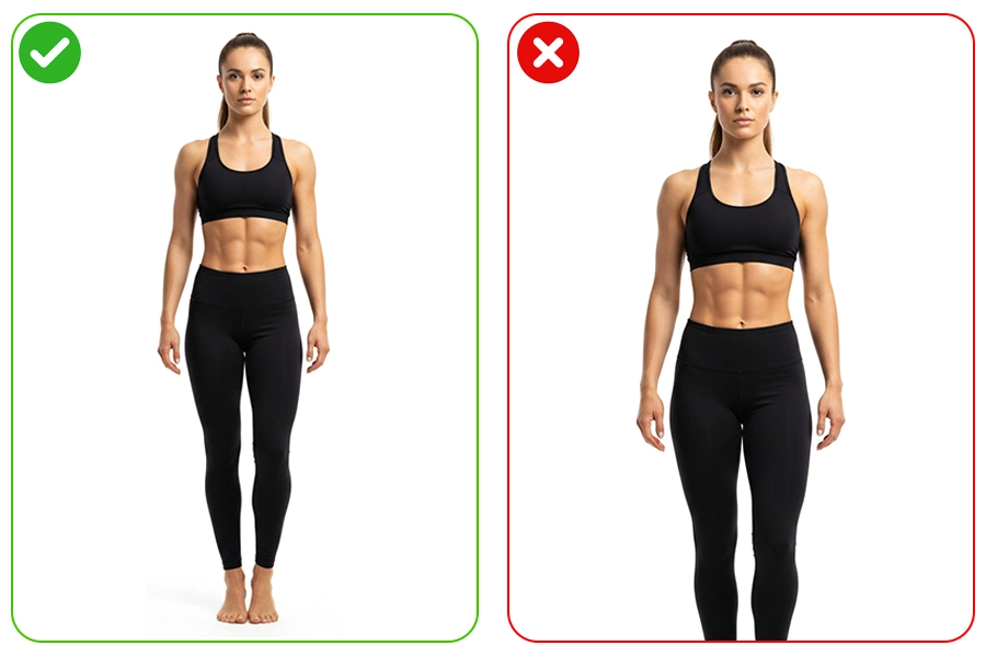 • نکته: لگ یا شلوارک نباید روی شکم و پهلو قرار بگیرد یا به سمت بالا کشیده شود؛ بهگونهای که ناحیهی زیر شکم و پهلو کاملاً مشخص باشد.