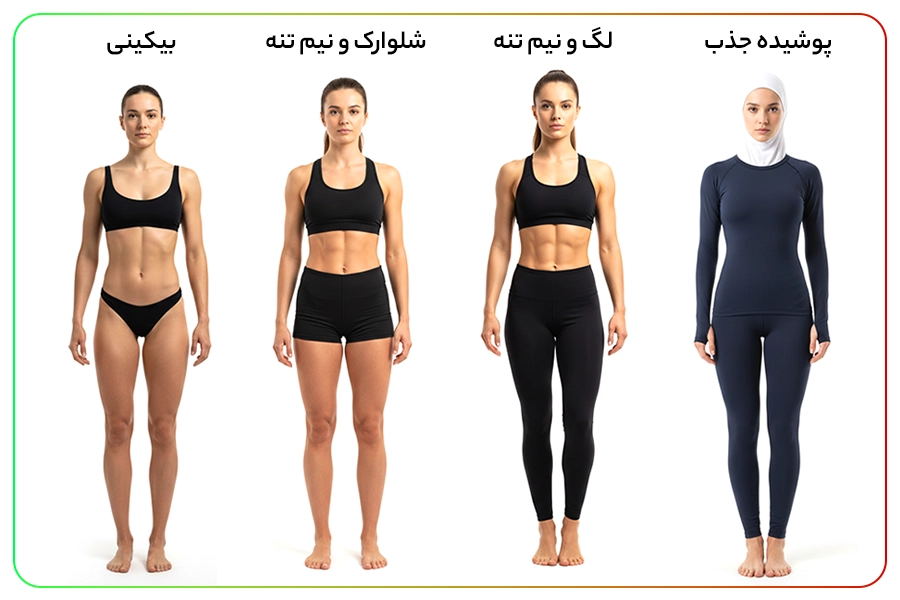 • در صورتی که با این موضوع راحت نیستید، میتوانید از شلوارک و نیمتنه یا لگ و نیمتنه استفاده کنید؛ بهشرطی که شکم و پهلو بهطور کامل مشخص باشد.